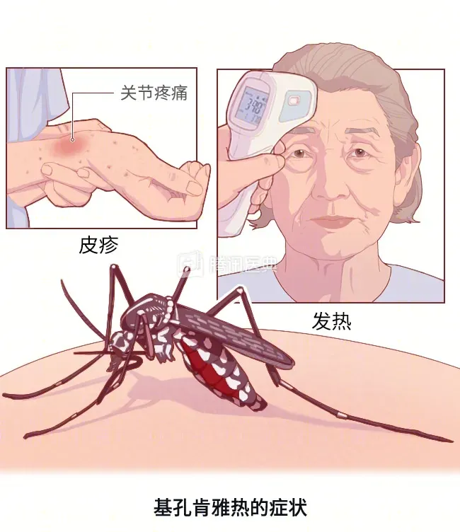 基孔肯雅热通过感染病毒的伊蚊(俗称花斑蚊)叮咬传播,症状以发热、关节剧痛和皮疹为主要特征。多数症状较轻,病程1-2周后可自行恢复,但少数患者可能发生慢性关节疼痛等(持续数月甚至数年)。