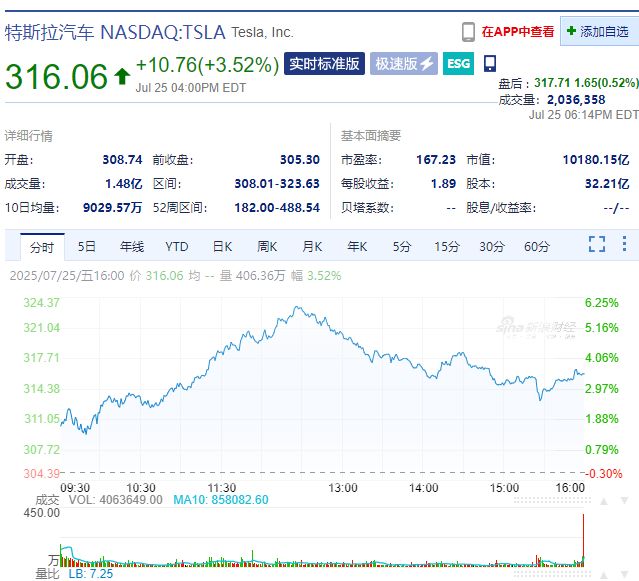 特斯拉盘中一度涨超6%,收盘涨超3.52%,报316.06美元,市值一夜增加347亿美元(约合人民币2487亿元)。